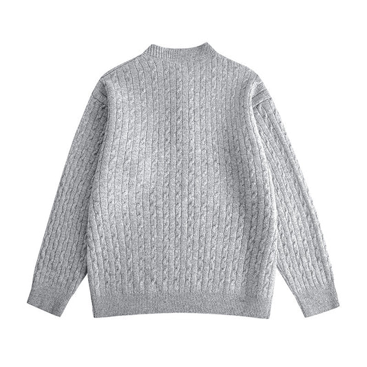 Cable Knit Buttoned Henley Neck Loose Pullover Sweater